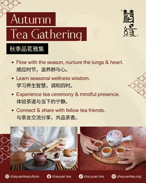 Autumn is a season of clarity and reflection, a time to nourish the lungs, soothe dryness, and find balance within. Guided by the way of tea, this gathering embraces the theme “Flowing with the Season, Nourishing the Lungs and Heart”through mindful rituals and meaningful connection.